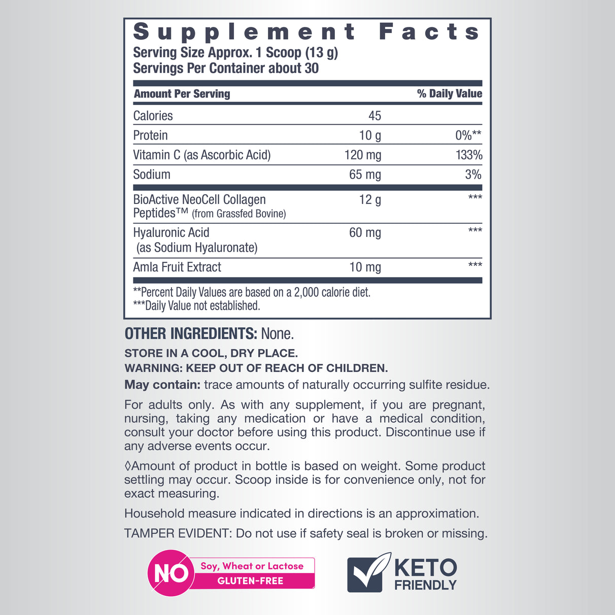 Types 1 & 3 hydrolyzed bovine collagen (12 grams), vitamin C as ascorbic acid (120 mg), hyaluronic acid as sodium hyaluronate (60 mg), amla (fruit) extract (10 mg)