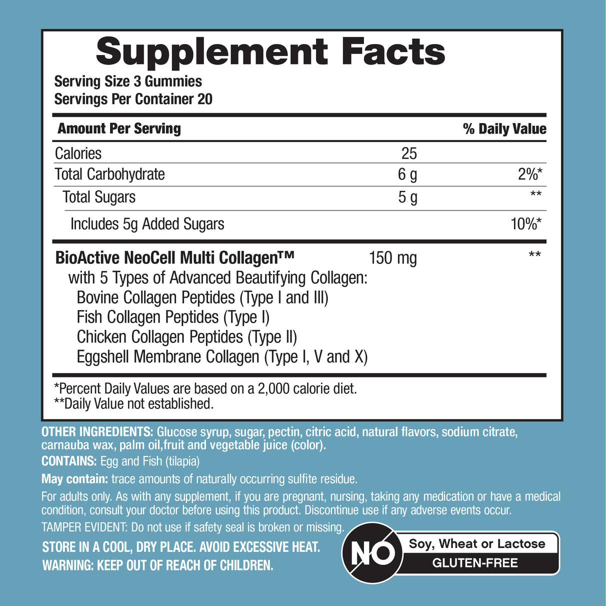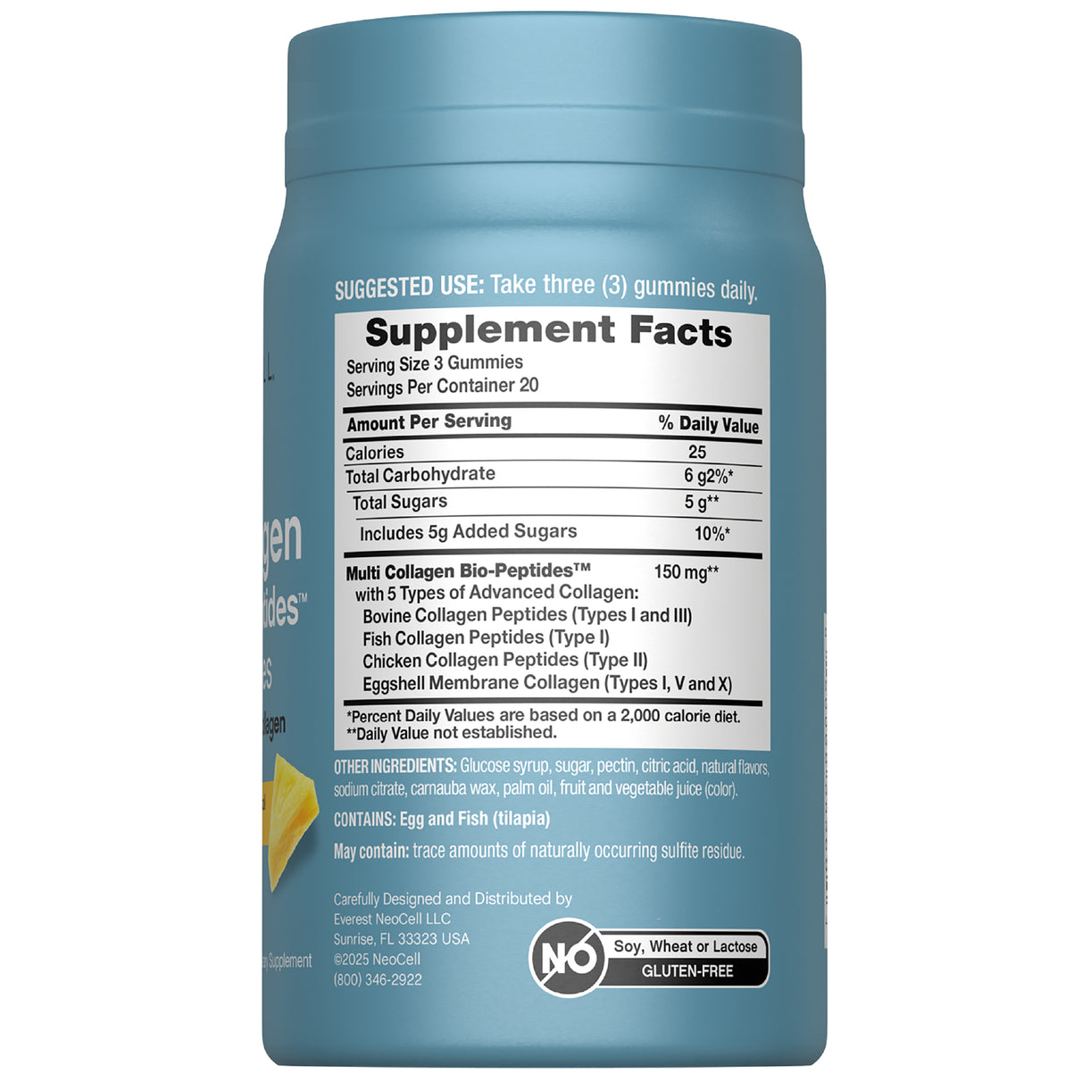 Le gomme NeoCell® Multi Collagen Bio-Peptides™ offrono una potente combinazione di cinque tipi di collagene beautificante: tipi I, II, III, V e X. Il collagene è la proteina più abbondante nel corpo umano, e questi cinque tipi aiutano a migliorare la tua routine di bellezza.