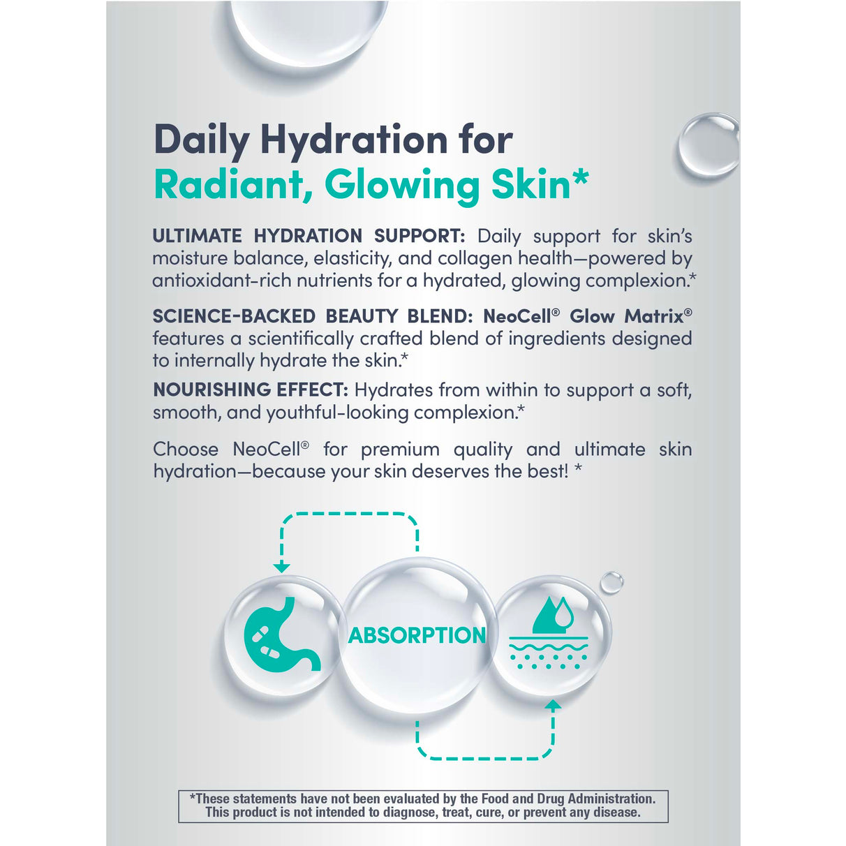 L'idratazione quotidiana della tua pelle è alimentata dall'interno.* NeoCell® Glow Matrix® combina Acido Ialuronico, Ceramidi e Acqua di Cocco per fornire l'idratazione definitiva e supportare l'umidità, l'elasticità e l'assorbimento della pelle.* Dal Marchio Numero 1 di Integratori di Bellezza, è la tua routine di luminosità – migliorata.**