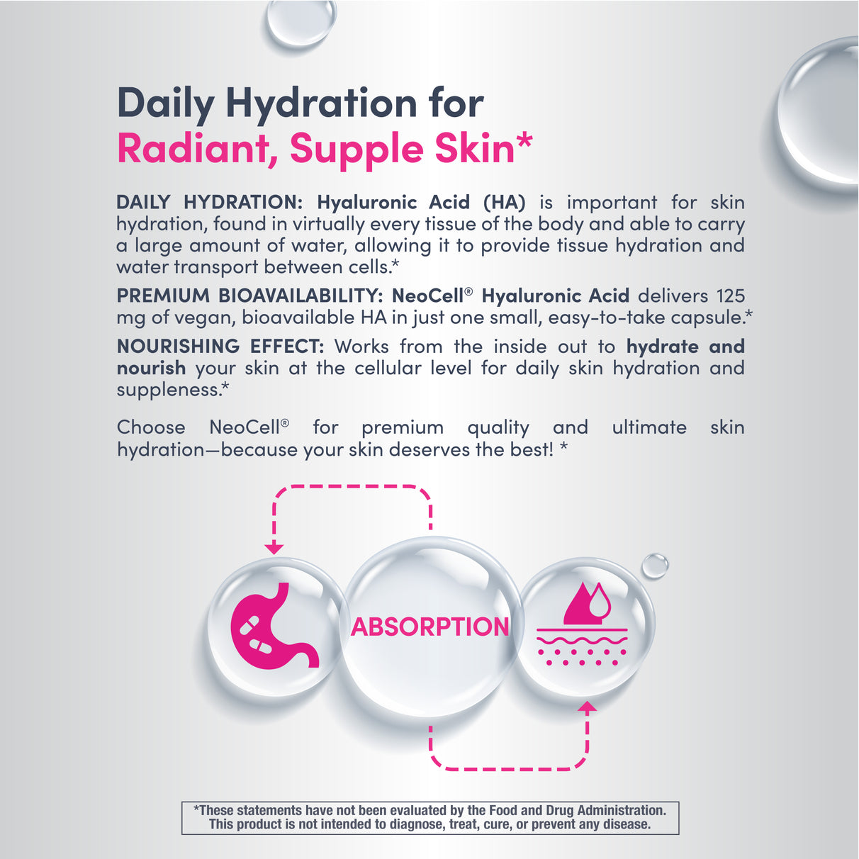 Elevate your beauty ritual with NeoCell® Hyaluronic Acid – your daily source of deep, inner hydration.* Formulated to support skin hydration, this once-daily vegan capsule helps support a glow that radiates well-being from within.* Our premium formula provides 125 mg of bioavailable Hyaluronic Acid in one small, easy-to-take vegan capsule daily.