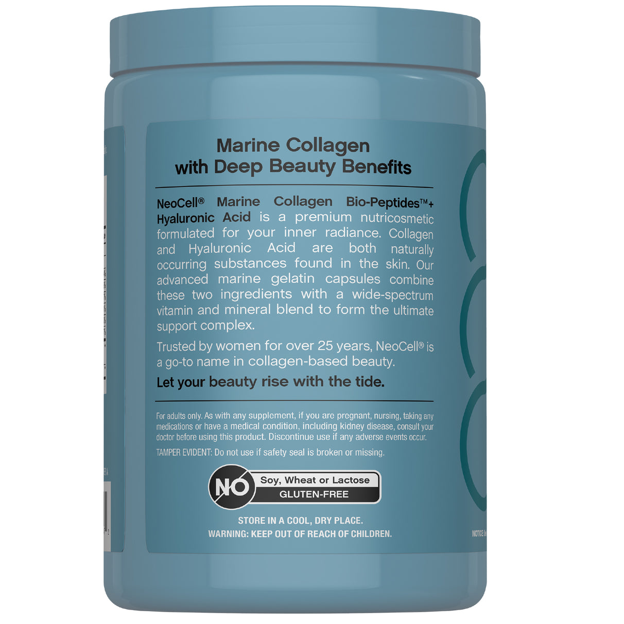Unleash your inner radiance with NeoCell® Marine Collagen Peptides + Hyaluronic Acid.* Our premium formula delivers 2,000 mg of marine-sourced collagen plus 20 mg of hyaluronic acid, along with key vitamins and minerals per serving. Designed for daily support, and as a wonderful alternative to bovine collagen, so you can shine from the inside out.