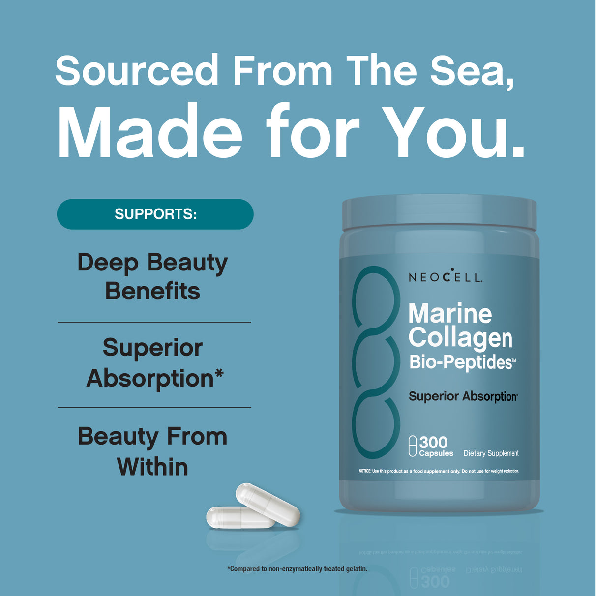 At NeoCell®, we prioritize premium quality collagen in every formula. Our Marine Collagen Peptides™ deliver 2,000 mg of collagen per serving, sourced from fish like tilapia, carp, and catfish. Marine collagen is known to be smaller in size as well, making it more bioavailable so your body can better absorb it.**