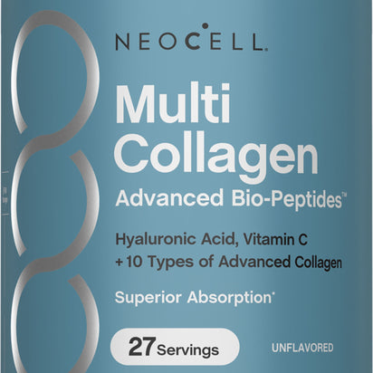 Fuel your glow with NeoCell® Multi Collagen Advanced Bio-Peptides™ powder. Each serving delivers 10 types of food-based collagen from grassfed and pasture-raised bovine, chicken, fish, and eggshell membrane; Hyaluronic Acid; and Vitamin C in the convenience of one formula. Our formula supports skin and joint health, skin elasticity, and antioxidant health.Δ