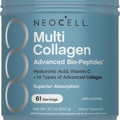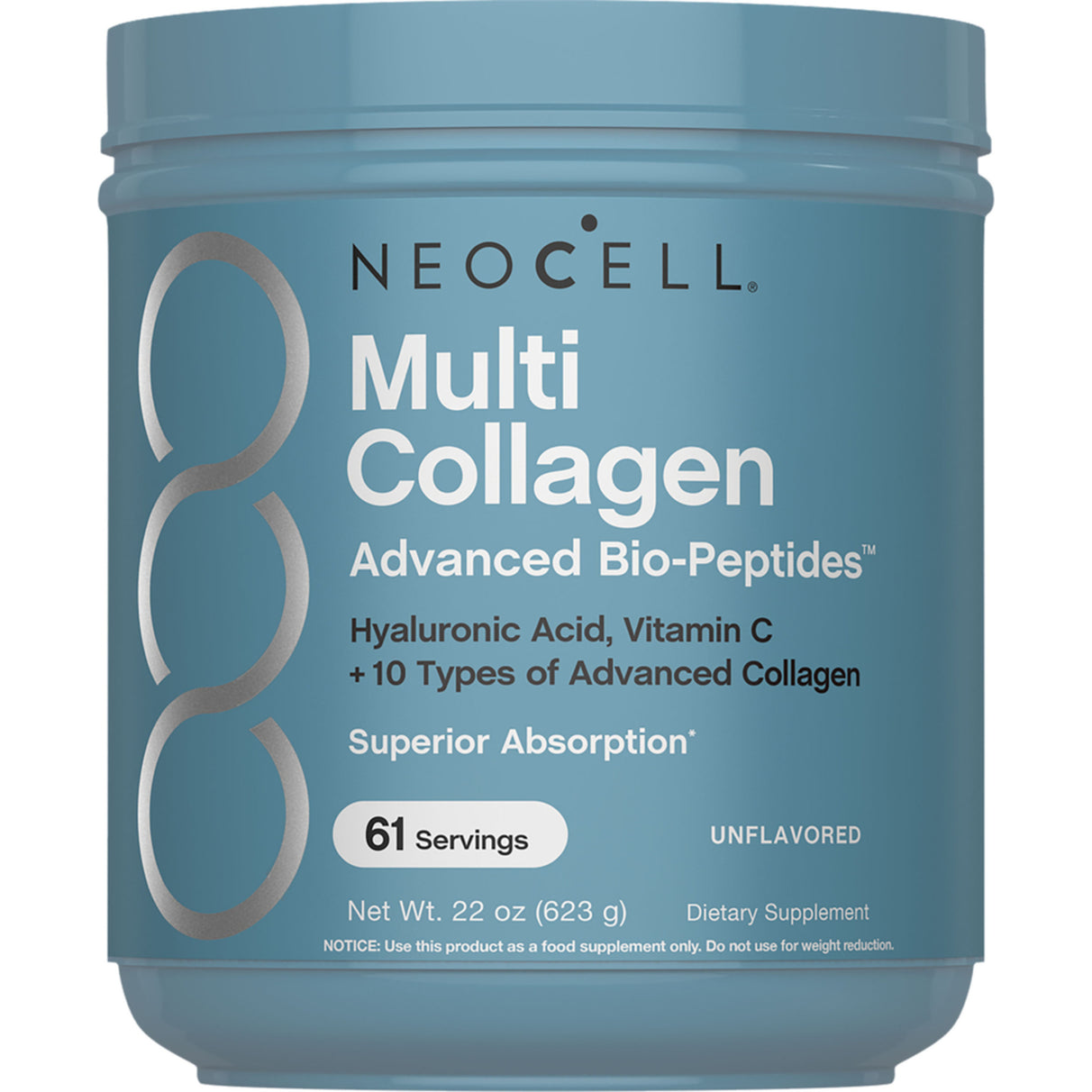 Fuel your glow with NeoCell® Multi Collagen Advanced Bio-Peptides™ powder. Each serving delivers 10 types of food-based collagen from grassfed and pasture-raised bovine, chicken, fish, and eggshell membrane; Hyaluronic Acid; and Vitamin C in the convenience of one formula. Our formula supports skin and joint health, skin elasticity, and antioxidant health.△