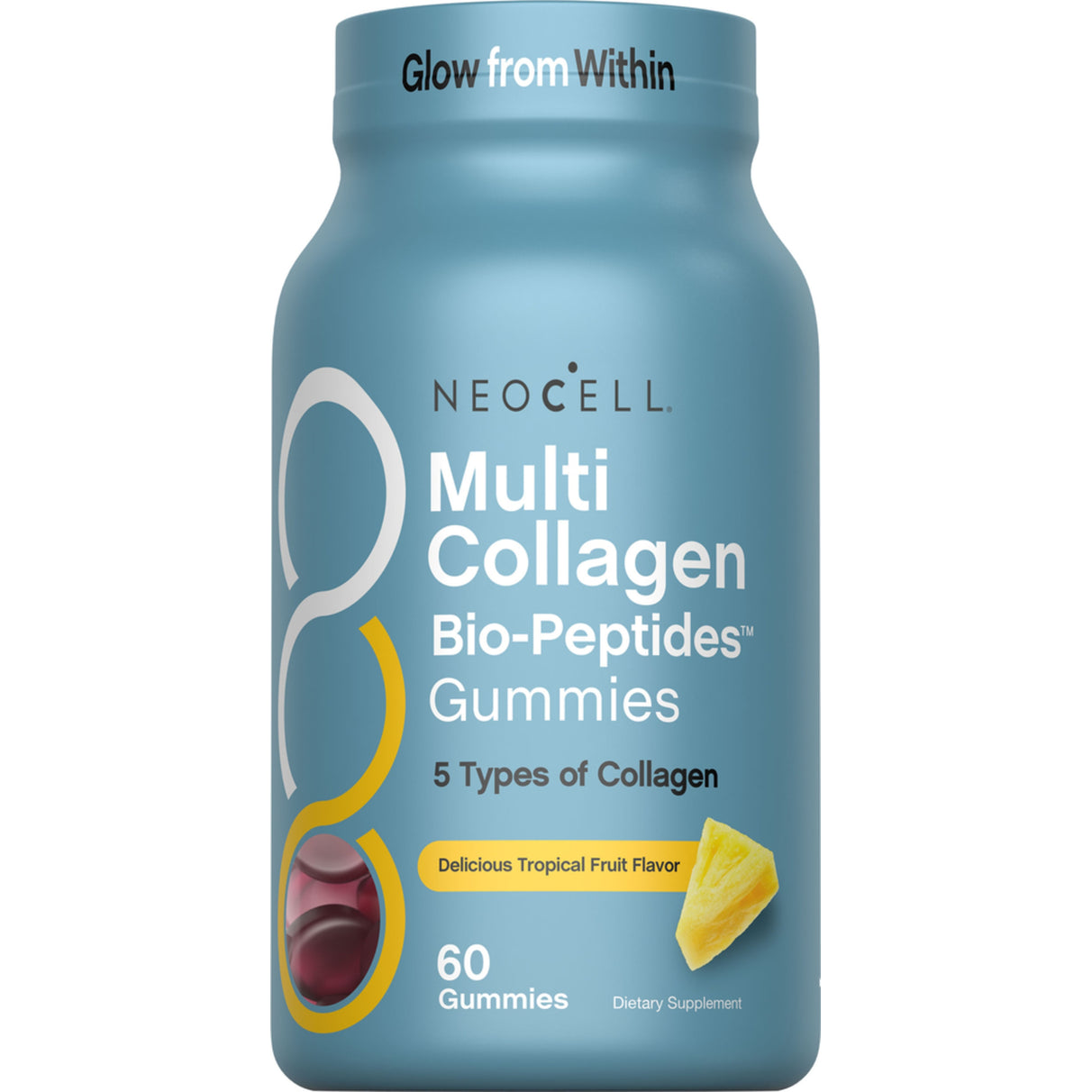 Glow from within with NeoCell® Multi Collagen Bio-Peptides™ Gummies. Each serving delivers 150 mg of BioActive NeoCell Multi Collagen™ which consists of five different types of collagen – types I, II, III, V, and X. With a delicious tropical fruit flavor, these convenient gummies make beauty and self care easy – any time, anywhere.